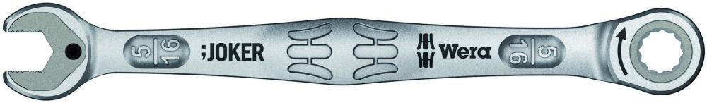 Высококачественный дюймовый комбинированный гаечный ключ с трещоткой фирмы Wera: всё, что должен делать гаечный ключ, и даже много больше. Быстрее, лучше, красивее. Прямо-таки настоящий Joker. Новое поколение комбинированных гаечных ключей с трещоткой для шестигранных винтов и гаек. С фиксирующей функцией с помощью металлической пластины в рожковой части, которая снижает риск потерять винт или гайку. Сменная металлическая пластина в рожковой части своими сверхтвердыми зубцами фиксирует винты и гайки и снижает риск их соскальзывания. Имеющийся упор может предотвратить соскальзывание ключа вниз с головки винта и позволяет приложить большее усилие. Форма двойного шестигранника обеспечивает плотный обхват винта или гайки и тем самым снижает риск соскальзывания. Угол возврата всего 30° в рожковой части исключает потерю времени на перекидывание ключа при завинчивании. Конструкция трещотки в накидной части ключа с необычайно тонким механизмом зацепления на 80 зубцов для гибкой работ