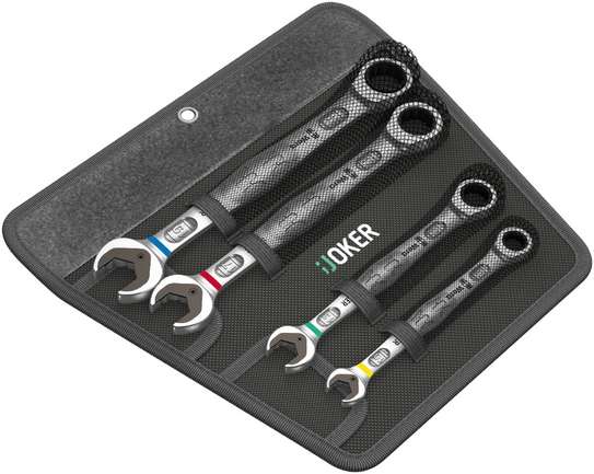 Набор высококачественных комбинированных гаечных ключей с трещоткой фирмы Wera: всё, что должен делать гаечный ключ, и даже много больше. Быстрее, лучше, красивее. Прямо-таки настоящий Joker. Новое поколение комбинированных гаечных ключей с трещоткой. Набор включает четыре ключа в прочной сумке. Для шестигранных винтов и гаек. С фиксирующей функцией с помощью металлической пластины в рожковой части, которая снижает риск потерять винт или гайку. Сменная металлическая пластина в рожковой части своими сверхтвердыми зубцами фиксирует винты и гайки и снижает риск их соскальзывания. Имеющийся упор может предотвратить соскальзывание ключа вниз с головки винта и позволяет приложить большее усилие. Форма двойного шестигранника обеспечивает плотный обхват винта или гайки и тем самым снижает риск соскальзывания. Угол возврата всего 30° в рожковой части исключает потерю времени на перекидывание ключа при завинчивании. Конструкция трещотки в накидной части ключа с необычайно тонким механиз