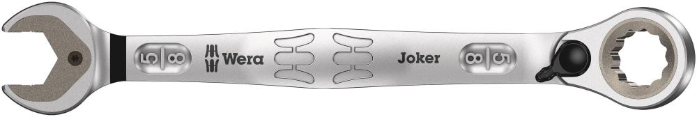 Комбинированный гаечный ключ Joker с изогнутой трещоткой и переключателем реверса. С фиксирующей функцией на основе металлической пластины в рожковой части, которая снижает риск потерять винт или гайку. Имеющийся упор может предотвратить соскальзывание ключа вниз с головки винта и позволяет приложить большее усилие. Сменная металлическая пластина в рожковой части своими сверхтвердыми зубцами фиксирует винты и гайки и снижает риск их соскальзывания. Форма двойного шестигранника обеспечивает плотный обхват винта или гайки и тем самым снижает риск соскальзывания. Угол возврата всего 30° в рожковой части исключает потерю времени на перекидывание ключа при завинчивании. Конструкция реверсной трещотки в накидной части ключа с необычайно тонким механизмом зацепления (80 зубцов) обеспечивает свободу действий даже в тесном пространстве. Точная даже на слух работа трещотки. Прочный стопор из двух элементов позволяет кроме того работать с экстремальными нагрузками. Наклон трещотки на