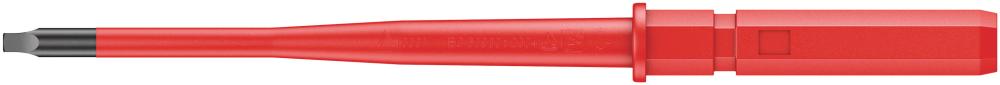 Сменная отвёртка с зауженным стержнем и защитной изоляцией, с помощью которой можно достать расположенные в глубине винты и пружинные зажимы. Инструменты проверены поштучно по стандарту IEC 60900. Поштучная проверка под напряжением 10000 В для безопасной работы на оборудовании с максимально допустимым напряжением 1000 В.