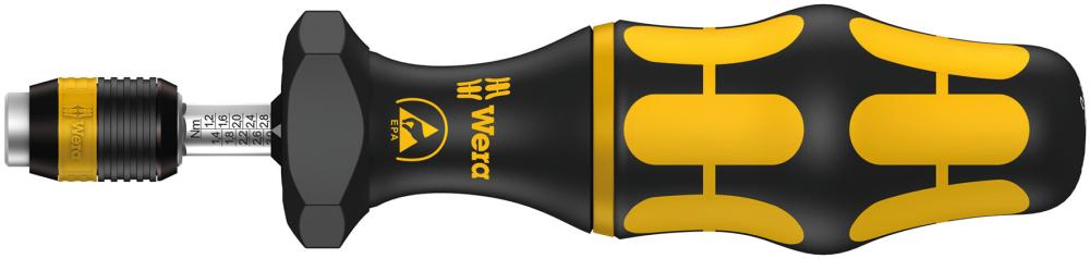 Динамометрическая отвёртка Wera. С заводской уставкой наименьшего по шкале значения момента затяжки. Для всех видов работ, когда важно сохранять неизменный момент затяжки в серийных операциях. Момент затяжки можно изменить в пределах диапазона значений с помощью особого инструмента (набор для рекалибровки, который доступен для заказа по коду 05137001001). Затем необходимо с помощью обычного контрольного прибора проверить значение момента затяжки. Неограниченный момент силы при отвинчивании проблемного крепежа. Быстрозажимной патрон с технологией Rapidaptor для моментальной смены насадок. Подходит для битов с шестигранным хвостовиком 1/4" по стандарту DIN ISO 1173-C 6,3 и Е 6,3 (ISO 1173). Многокомпонентная ручка Kraftform с твёрдыми и мягкими зонами для обеспечения высокой скорости работы и для щадящего контакта с ладонью.