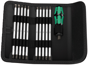 Набор Vario из 11 предметов с ручкой-держателем и рабочими концами. В практичной поясной сумке, в которой инструменты надёжно хранятся, защищены от загрязнений и всегда находятся под рукой. Ручка Kraftform держателя обеспечивает комфортную работу без появления на руках мозолей и волдырей. Твердые зоны ручки для высокой скорости работы, в то время как мягкие зоны ручки обеспечивают передачу больших моментов силы. Шестигранный край ручки предотвращает надоедливое перекатывание отвёртки на рабочем месте. Наличие вспомогательного шестигранника помогает с помощью рожкового или накидного ключа передавать больший момент силы. Двусторонние рабочие концы выпускаются из высококачественного материала для изготовления битов и поэтому имеют долгий срок службы. Наконечник Wera Black Point рабочих концов обеспечивает точность работы и оптимальную защиту от коррозии.