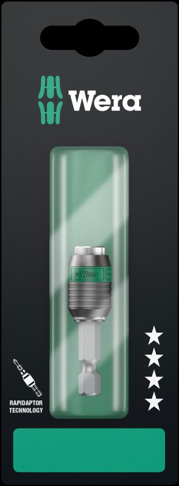 Универсальный держатель Rapidaptor для битов с шестигранным хвостовиком 1/4" по стандарту DIN ISO 1173-C 6,3 и E 6,3 (ISO 1173). Rapidaptor позволяет ставить биты даже без использования гильзы. Извлечение битов осуществляется простым сдвиганием гильзы вперед — моментальная смена битов даже одной рукой. Сильный постоянный магнит держит биты мертвой хваткой. Наружный шестигранник 1/4" стержень подходит для использования в шуруповертах с патроном по стандарту DIN ISO 1173-F 6,3.