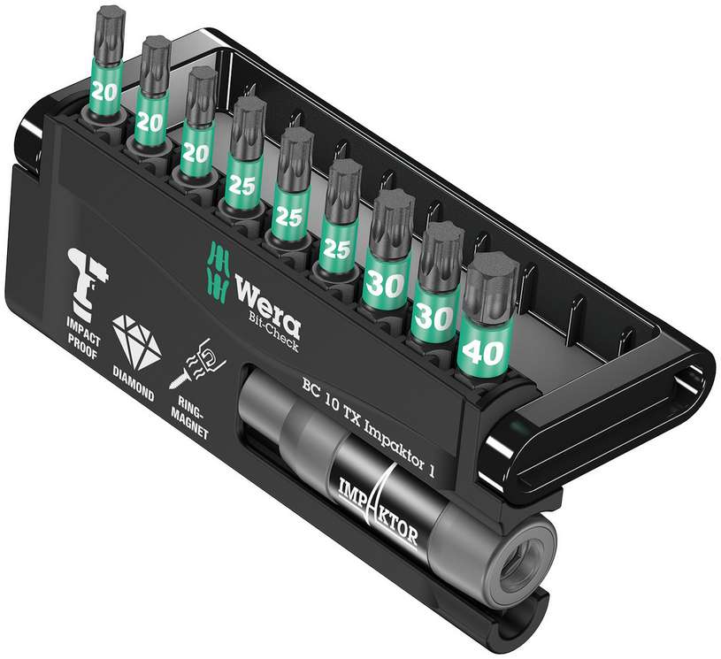 Набор в прочном футляре Bit-Check фирмы Wera. Наборы Bit-Check обеспечивают полный обзор всех размещённых инструментов. Лишние в работе биты просто возвращаются на свое место в футляре, чтобы не потерялись. Простая переноска, например, в кармане рубашки. Технология Impaktor обеспечивает срок службы инструментов, заметно превышающий средние показатели даже с учетом жестких условий их применения. Повышенное сопротивление трением за счёт шероховатого покрытия из алмазных частиц предотвращает выскальзывание наконечника из винта. Особенно подходят для работы с предлагаемыми на рынке ударными винтовертами. Держатель Impaktor Wera для смягчения максимальных импульсных скачков. Особый эффект за счёт наличия двух разных торсионных зон. С круглым магнитом для простой фиксации даже длинных и тяжелых винтов, идеально для работы в положении над головой. Особенно подходят для работы с предлагаемыми на рынке ударными винтовертами. Магнит можно отвести назад, тем самым нейтрализовав его дейст