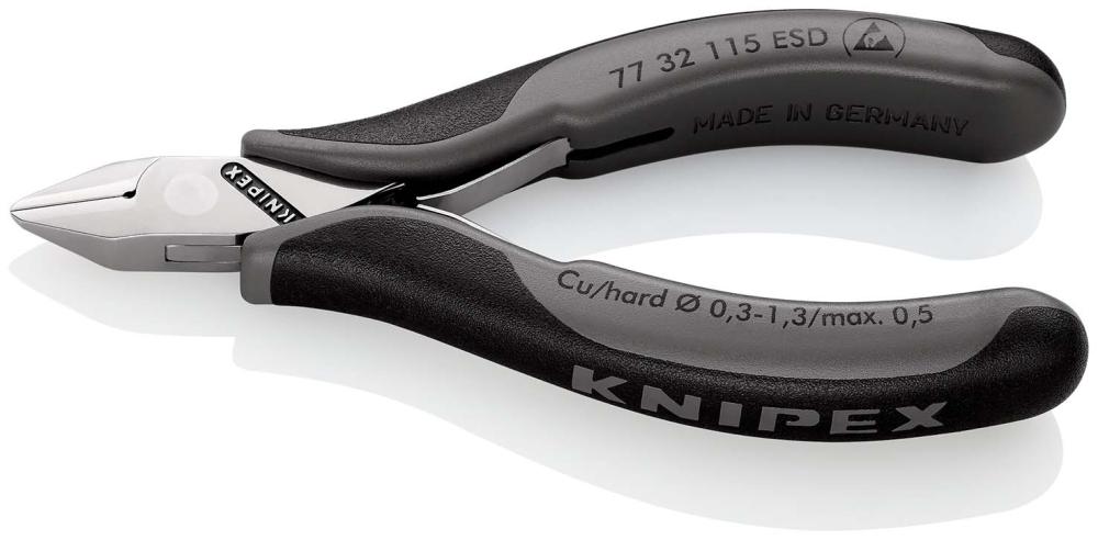 77 02 115 Бокорезы для электроники для самых тонких работ по резке, например, в электронике и точной механике. Выбор геометрических параметров с учётом возникающих нагрузок для обеспечения точности манипулирования с деталью. устойчивый коробчатый безлюфтовый шарнир. плоская двуперая пружина с малым трением. финишная отделка — зеркальная полировка в сочетании с тонкой масляной пленкой обеспечивает хорошую защиту от коррозии и предотвращает возникновение трещинв покрытии, возникающих при отскакивании частиц хромового покрытия. Лезвия с дополнительной лазерной закалкой, твёрдость не менее 60 HRC. тонкие, подтянутые к головке инструмента чехлы обеспечивают уверенное и удобное манипулирование инструментом между большим и указательным пальцами. скругленная головка, с маленькой фаской. Твёрдость режущих кромок примерно 60 HRC. — Параметры резания /проволока средней твёрдости (диаметр): Ø 1,2mm — Параметры резания / твёрдая проволока (диаметр): Ø 0,6mm — Параметры резания / мягкая проволока (
