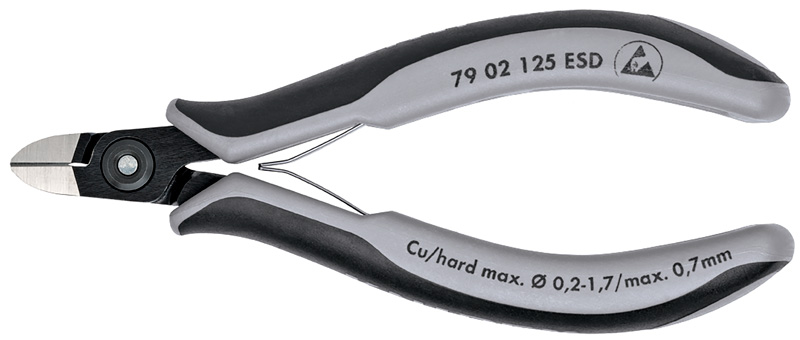 79 02 125 ESD Прецизионные бокорезы для электроники антистатические ESD кусачки прецизионные для самых тонких работ по резанию, например, в электронике и точной механике. точно шлифованные режущие кромки с очень малыми фасками для точной резки чувствительных деталей электроники; также без фаски для резки заподлицо. прецизионные режущие кромки дополнительно закалены токами высокой частоты, твердость режущих кромок примерно 64 HRC. почти на 20 % меньший вес по сравнению с традиционными клещами для электроники. винтовой шарнир с особенно тщательно выполненными рабочими поверхностями для равномерного движения. двойная пружина с легким ходом. Эргономичные двухкомпонентные чехлы. круглая головка. — Параметры резания /проволока средней твёрдости (диаметр): Ø 1,3mm — Параметры резания / твёрдая проволока (диаметр): Ø 0,7mm — Параметры резания / мягкая проволока (диаметр): Ø 0,2 – 1,7mm — Длина губок (B): 10mm — Толщина губки (шарнир) (D): 6,5mm — Ширина головки (A): 11mm — антистатический инс