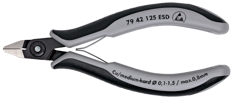 79 22 125 Прецизионные бокорезы для электроники кусачки прецизионные для самых тонких работ по резанию, например, в электронике и точной механике. точно шлифованные режущие кромки с очень малыми фасками для точной резки чувствительных деталей электроники; также без фаски для резки заподлицо. режущие кромки дополнительно закалены токами высокой частоты до твердости примерно 64 HRC. почти на 20 % меньший вес по сравнению с традиционными клещами для электроники. винтовой шарнир с особенно тщательно выполненными рабочими поверхностями для равномерного движения. двойная пружина с легким ходом. Эргономичные двухкомпонентные чехлы. круглая головка. — Параметры резания /проволока средней твёрдости (диаметр): Ø 1,0mm — Параметры резания / мягкая проволока (диаметр): Ø 0,1 – 1,7mm — Длина губок (B): 10mm — Толщина губки (шарнир) (D): 6,5mm — Ширина головки (A): 11mm