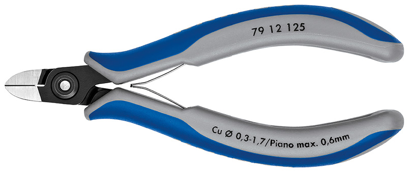 79 12 125 Прецизионные бокорезы для электроники кусачки прецизионные для самых тонких работ по резанию, например, в электронике и точной механике. точно шлифованные режущие кромки с очень малыми фасками для точной резки чувствительных деталей электроники; также без фаски для резки заподлицо. режущие кромки дополнительно закалены токами высокой частоты до твердости примерно 64 HRC. почти на 20 % меньший вес по сравнению с традиционными клещами для электроники. винтовой шарнир с особенно тщательно выполненными рабочими поверхностями для равномерного движения. двойная пружина с легким ходом. Эргономичные двухкомпонентные чехлы. специально для резки твердой проволоки, а также рояльной струны. — Параметры резания /проволока средней твёрдости (диаметр): Ø 1,3mm — Параметры резания / твёрдая проволока (диаметр): Ø 1,0mm — Параметры резания / рояльная струна (диаметр): Ø 0,6mm — Параметры резания / мягкая проволока (диаметр): Ø 0,3 – 1,7mm — Длина губок (B): 10mm — Толщина губки (шарнир) (D):