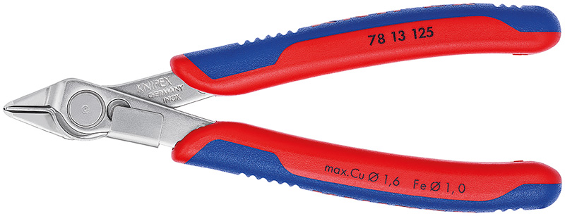 78 13 125 Electronic Super Knips® кусачки прецизионные для самых тонких работ по резанию, например, в электронике и точной механике. шлифованные, очень острые режущие кромки без фасок. Прецизионные кончики режут заподлицо проволоку диаметром от 0,2 мм. Рез с контролируемым смещением режущей кромки – для увеличениясрока службы и высокоточной резки самых тонких проводов. шарнир с заклепкой из легированной стали. исключительно легкий ход для работы с минимальным утомлением. с раскрывающей пружиной и ограничителем раскрытия. с зажимом для проволоки — никакого случайного отскока отрезанных кусков проволоки. Твёрдость режущих кромок примерно 54 HRC. INOX — инструментальная сталь. — Параметры резания /проволока средней твёрдости (диаметр): Ø 1,0mm — Параметры резания / мягкая проволока (диаметр): Ø 0,2 – 1,6mm — Длина губок (B): 9mm — Толщина губки (шарнир) (D): 7,5mm — Ширина головки (A): 13,5mm